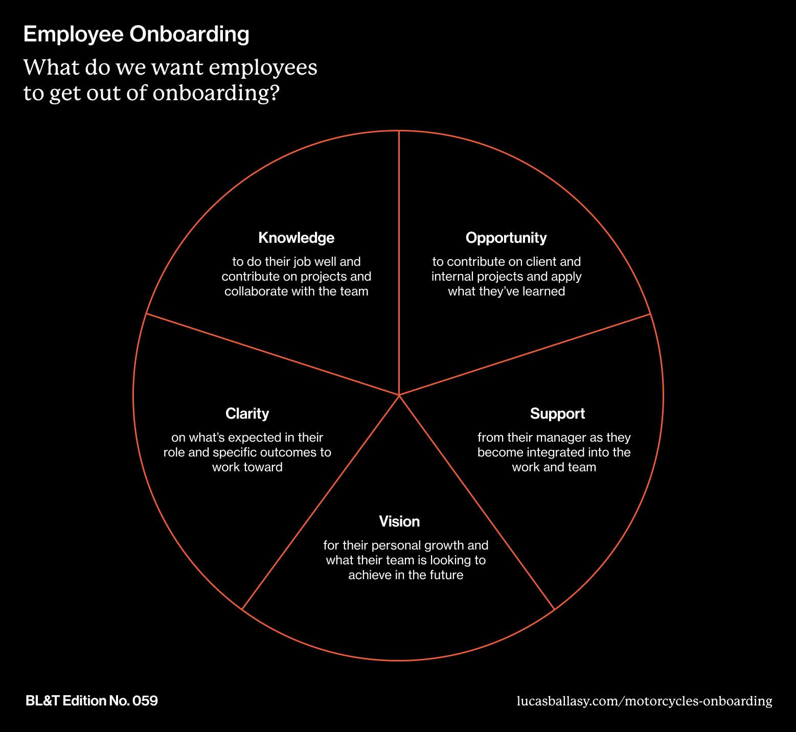 Our goal is simply to get designers acquainted with how we collaborate, know who to go to for what, and comfortable enough to ask for help. The daily, weekly, monthly rituals take care of the rest (daily stand-ups, staffing structures, etc). By week two, they're assigned to client work and paired with other designers for oversight. While this has worked well at a discipline-level, I wonder how it could integrate with company-wide onboarding and what elements of the approach could carry over.